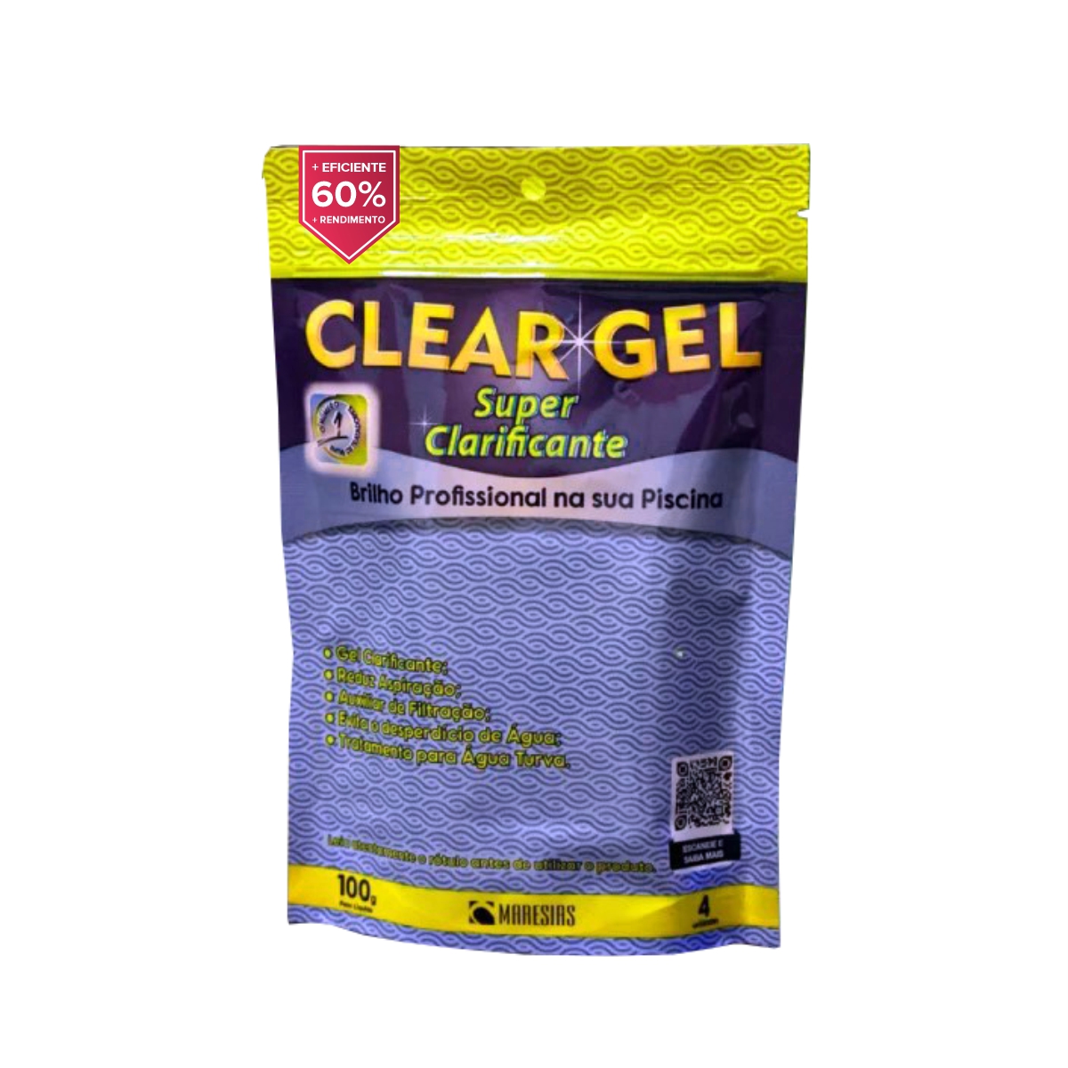 A embalagem com 4 unidades de Clear Gel trata até 160.000 litros de água.